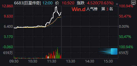“周杰伦概念股”巨星传奇盘中放量大涨100%,截至午间收盘该股涨70.62%,报10.92港元,总市值94亿港元。