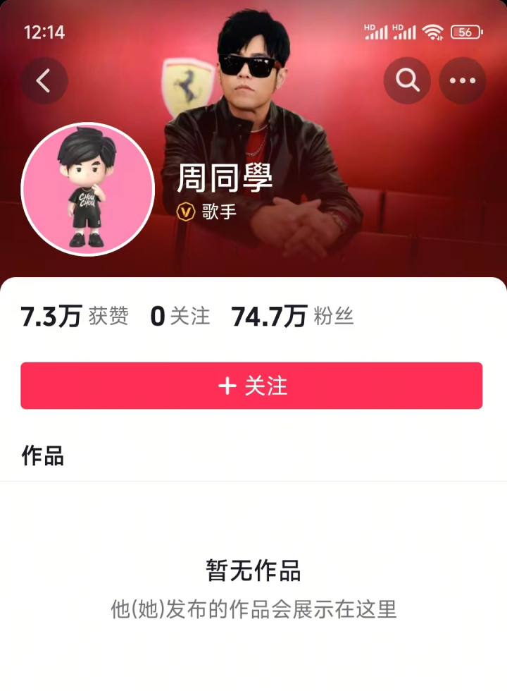 华语流行音乐“天王”周杰伦今日正式入驻抖音平台,名称“周同学”,认证身份为歌手。该账户目前粉丝数74.7万,尚未发布作品,未关注任何账号。